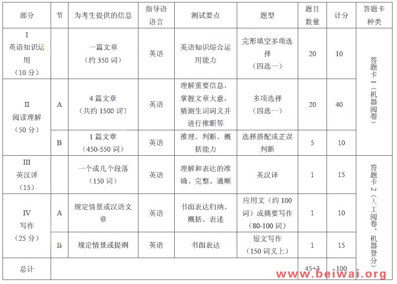 根据专业学位研究生选拔特点和培养要求,初试外国语设置“英语(二)”供19个专业学位类别中的部分专业类别使用,原统考“英语”更名为“英语(一)”,除继续供统考使用外,部分对英语水平要求较高的专业学位类别也使用“英语(一)”。本书为《英语(二)考试大纲》。