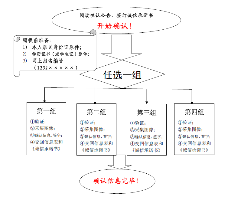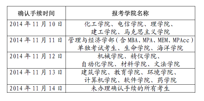 四、确认时间安排: 为减少考生等候时间,请考生尽量按照下面时间安排确认报名信息。因特殊原因不能按规定时间确认信息的考生,可任选其中一天办理报名确认手续。