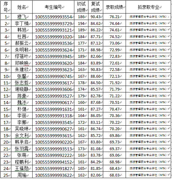 2015南开大学旅游管理硕士学位(MTA)拟录取名单
