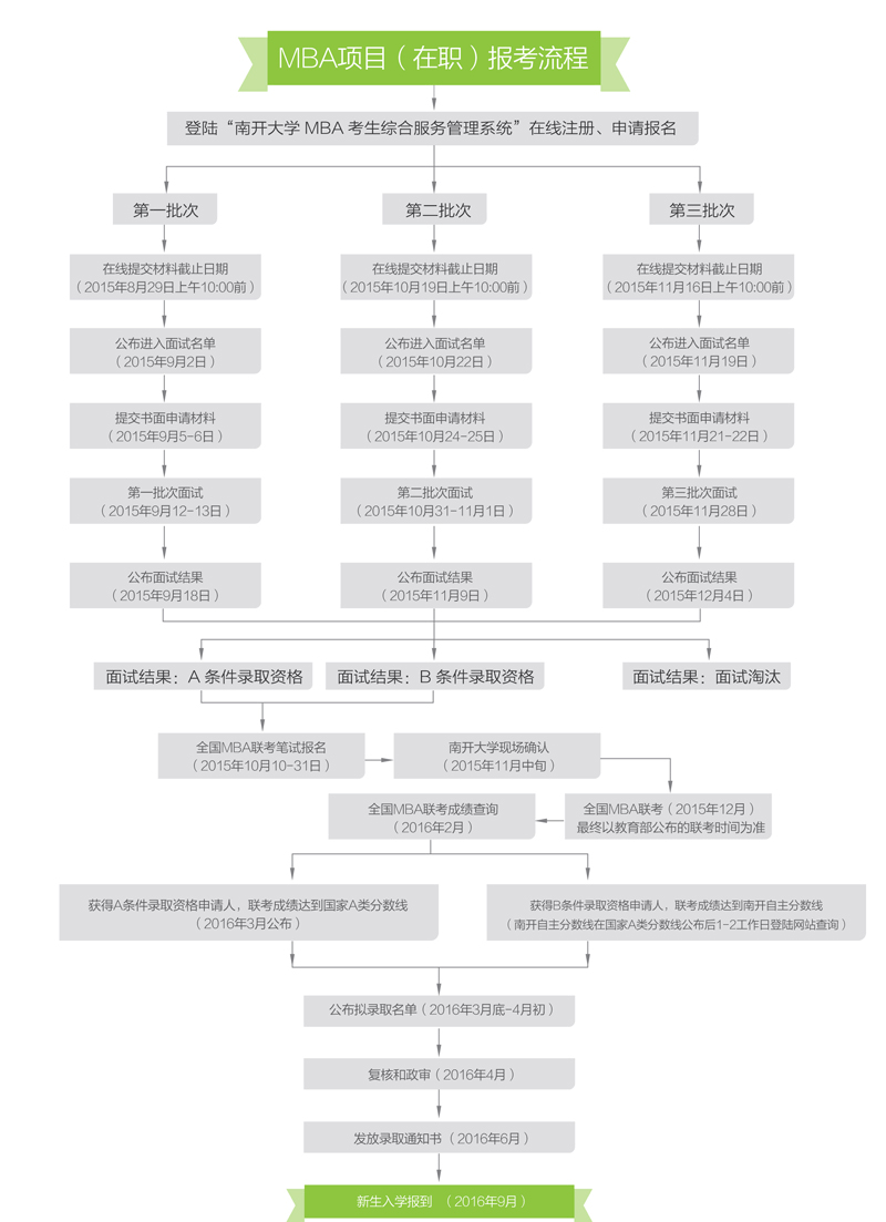 (1)获得A条件录取资格的申请人参加2015年12月份在南开大学考点举行的全国MBA联考,且联考成绩达到国家A类分数线,并提交南开大学要求的政治论文,经审查合格后,由招生委员会审核通过后,获得拟录取资格。