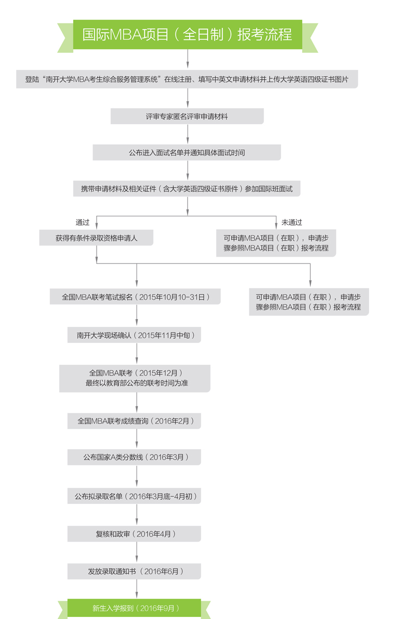 (1)获得国际MBA项目(全日制)有条件录取资格的申请人参加2015年12月份在南开大学考点举行的全国MBA联考。