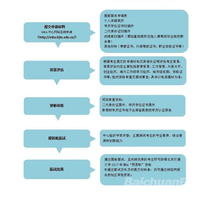 [百川教育网讯】为选拔优质生源,增加考生自主选择的机会,北京交通大学工商管理硕士(MBA)项目2017年将继续实行“提前批面试+正常批面试”的招生政策,在招生流程上,秉承“公平、公正、公开、公信”的基本原则,凡在北京交通大学通过提前面试,且成绩优秀的考生即可获得北京交通大学2017年MBA“预录取”资格。提前面试工作将于6月启动,具体事宜如下: