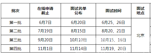②填写和上传申请材料。网上提交的申请材料包括:申请书、成绩单、个人简历、单位组织结构图、推荐信(非必需)。申请材料的具体内容和要求见系统内说明。考生提交申请材料时需要选择申请面试批次,并在所选批次申请材料提交截止日期前提交。各批次的申请截止时间和面试时间见下页"面试批次"表。