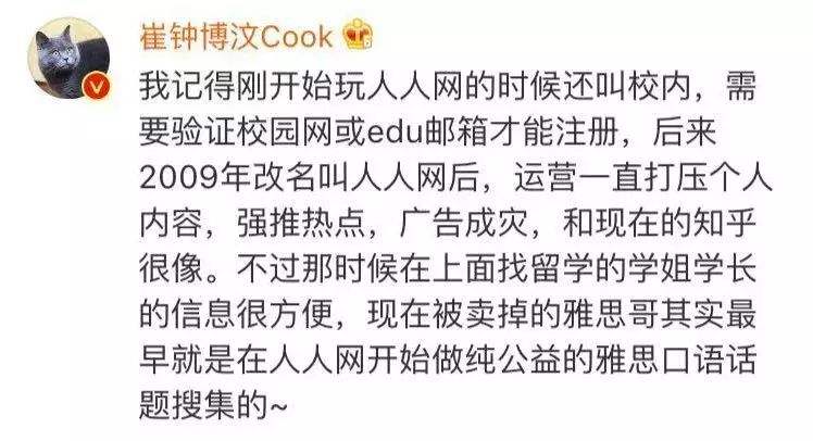 @金刀王:校内网开始就作为活跃注册用户了,那时候沉迷社交网络,沉迷的就是校内人人网。多少青春多少回忆都在人人网,偷菜做饭小游戏,女票兄弟铁练手,没有不在人人网留下回忆。直到现在时不时还会上去看看,尽管人人已经变成视频直播网站,还是忍不住去缅怀一下青春无悔。人人网现在被卖了,感觉不好了青春被割裂的感觉,希望新东家可以重振雄风。