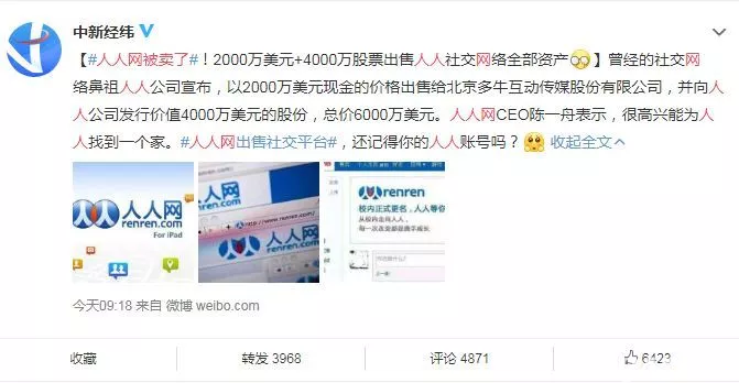 2018年11月14日,人人公司宣布将人人网社交平台业务相关资产,以2000万美元现金对价出售予北京多牛互动传媒股份有限公司。同时,买方母公司同意按照双方认可的7亿美元买方母公司估值向人人公司发行相当于4000万美元的股份。