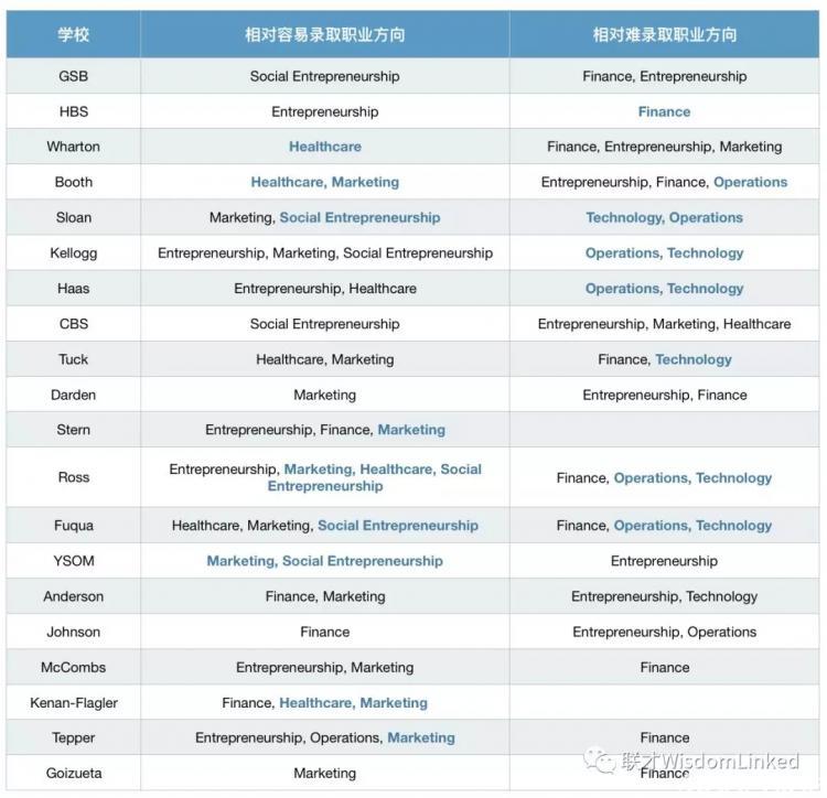 从数据上来看,比如在GSB的录取中,Social Entreprenuership是最容易录取的职业方向,Entreprenuership却是相对来说最难的(当然这也并不奇怪,奔着GSB去的entrepreneur也是成百上千的比别家商学院的都多);对于Wharton来说,Healthcare是相对较容易录取的方向,Wharton近年来一直在大力拓展healthcare facilities & supports,这也足以证明它在增加healtchare方向diversity的决心。