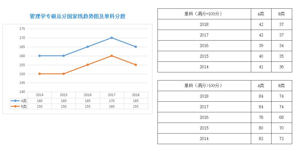 以下图表分数为工商管理(MBA)、公共管理(MPA)、工程管理(MEM)、图书情报(MLIS)、会计(MPAcc)、旅游管理(MTA)2014-2018年联考国家线分布趋势: