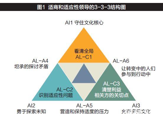 本文的主要观点可以用图1来说明。图1里面包括了三个嵌套的三角形,每个三角形的顶点表示本文要论述的一个点。图1中,AI是英文AdaptiveIntelligence的缩写,意思是适商。AL是英文Adaptive Leadership的缩写,意思是适应性领导。在图1中,组织适商包括了三个方面(AI1、AI2、AI3),适应性领导包括了六个方面,其中三个方面和认知(Cognition)相关(AL-C1、AL-C2、AL-C3),三个方面和行动(Action)相关(AL-A1、AL-A2、AL-A3)。适应性领导作为活动,反映了领导过程,适商反映了结果。