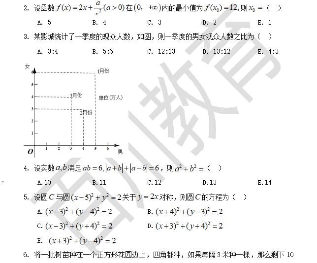一、问题求解:第1-15小题,每小题3分,共45分。下列每题给出的五个选项中,A、B、C、D、E只有一个选项符合试题要求。