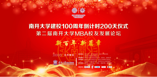 今天我们欢聚一堂迎接南开大学百年校庆倒计时200天,举办第二届MBA校友发展论坛。1月17日上午,习近平总书记视察南开大学,充分肯定了南开爱国奋斗、公能日新的光荣传统和办学方向。习总书记说:“我们现在迎来了从站起来、富起来到强起来的阶段,我们要把学习的具体目标同民族复兴的宏大目标结合起来,为之而奋斗。只有把小我融入大我,才会有海一样的胸怀、山一样的崇高。希望你们脚踏实地,在新的起点做出你们这一代人的历史贡献,成为南开大学新的骄傲。”这是习总书记对所有南开人的期望和嘱托。我们以“新百年 新篇章”为主题召开第二届南开大学MBA校友发展论坛,共同回顾南开百年商科历程,面向未来、共谋发展。
