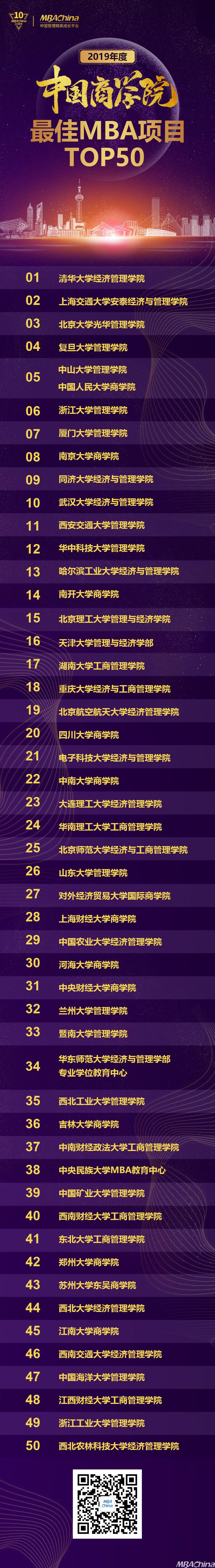 下图为2019年度中国商学院最佳MBA项目TOP50排行榜完整榜单: