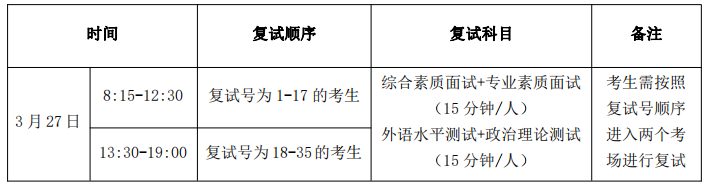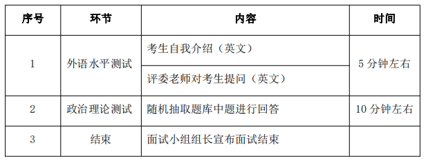 复试环节包括综合素质面试、专业素质面试、外语水平测试、政治理论测试。综合素质面试满分 100 分,专业素质面试满分 150 分,外语水平测试满分 50 分,政治理论测试满分 100 分。复试时间每人不少于 30 分钟。