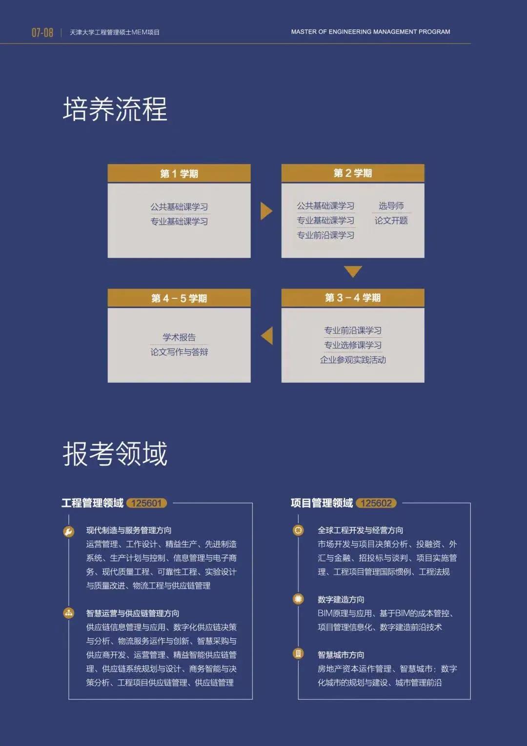 各院校对MEM设立了多个培养方向,比如天津大学在2022年招生简章中提到的5个培养方向:现代制造与财务管理方向、只会运营与供应链方向、全球工程开发与经营方向、数字建造方向、智慧城市方向;武汉大学则招收商业/金融数据分析工程管理硕士专业学位研究生。
